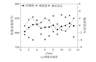 在連續(xù)監(jiān)測(cè)穩(wěn)定運(yùn)行階段多個(gè)切換周期后,將燃燒室三個(gè)熱電偶及變送器監(jiān)測(cè)的爐膛溫度值計(jì)算得到平均值,同時(shí)將每個(gè)蓄熱室中的出口位置熱電偶的溫度值進(jìn)行記錄,圖2為同一測(cè)點(diǎn)的工程實(shí)際數(shù)據(jù)與數(shù)值模擬值的對(duì)比。通過(guò)對(duì)比,得到溫度模擬數(shù)據(jù)與實(shí)際監(jiān)測(cè)值的相對(duì)誤差均在4%以內(nèi),這也可能是RTO裝置的切換閥因閥板和閥座密封性很難保證、氧化爐爐膛上部的防爆裝置存在泄漏,以及溫度監(jiān)測(cè)設(shè)備的精確度不夠等問(wèn)題造成的。因此,燃燒室和蓄熱室溫度測(cè)點(diǎn)監(jiān)測(cè)值的平均值和模擬值相對(duì)誤差滿足數(shù)值模型準(zhǔn)確性的要求,所以此數(shù)值模型可以較好的反應(yīng)RTO裝置在正常運(yùn)行階段的溫度變化情況。
